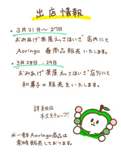 3月21日~27日おみあげ茶屋えっさほいさ店内にてお土産の販売、28日・29日店外にて和菓子の販売を行います。 名古屋城にお越しの際はぜひお立ち寄りくださいませ。 場所:名古屋市中区三の丸1丁目2-4金シャチ横丁おみあげ […]