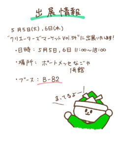 クリエーターズマーケットVol .54に出展いたします! 日時:2026年5月5日(火)、6日(水)11:00~18:00 場所:ポートメッセなごや1号館 ブース:B-82 オリジナルキャラクターグッズを販売! お待ちし […]