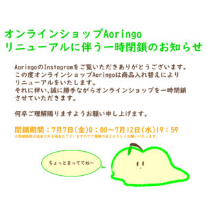 Aoringoホームページをご覧いただきありがとうございます。 この度オンラインショップAoringoは商品入れ替えによりリニューアルをいたします。 それに伴い、誠に勝手ながら2023年7月7日(金)0:00~2023年 […]