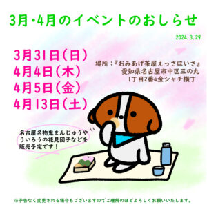 日時:3月31日(日)、4月4日(木)、5日(金)、13日(土)10:00~ 場所:おみあげ茶屋えっさほいさ 名古屋市中区三の丸1丁目2番4 販売商品:鬼まんじゅう、花見団子、桜餅等 名古屋にお越しの際はぜひお立ち寄りく […]
